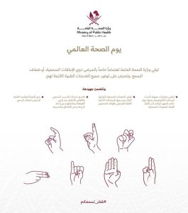 وزارة الصحة القطرية: في يوم الصحة العالمي، نحتفي بالعمل الجاد الذي تقوم به الكوادر الطبية في منشآت الرعاية الصحية لتوفير أفضل الخدمات الطبية للجميع، ومن ضمنهم ذوي الإعاقات السمعية، من خلال أحدث التقنيات العالمية.