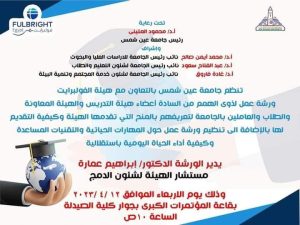 تنظم جامعة عين شمس بالتعاون مع هيئة الفولبرايت ورشة عمل لذوي الهمم من أعضاء هيئة التدريس والهيئة المعاونة والطلاب والعاملين بالجامعة لتعريفهم بالمنح التي تقدمها الهيئة وكيفية التقديم لها.